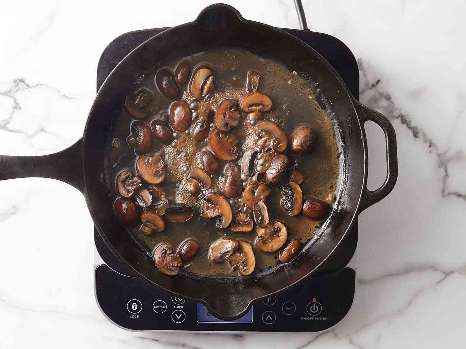 - Step 7:Set skillet on the stovetop over medium-high heat; cook and stir mushrooms until brown bits start to form on the bottom of the pan, about 5 minutes. Pour water into the skillet, and bring to a boil while scraping the browned bits off of the bottom of the pan. Cook until water is reduced by half, about 2 minutes. Remove from heat. Dotdash Meredith Food Studios